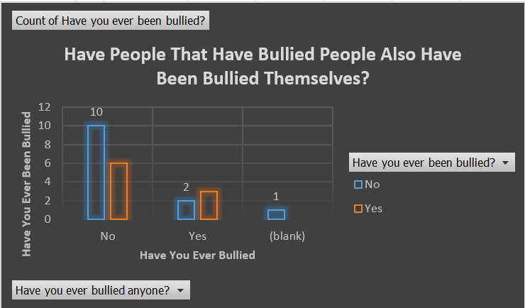 This graph shows how many people have bullied someone have also been bullied themselves. 10 people who have NOT been bullied said they have NOT bullied. d 6 people who have NOT been bullied said they bullied. 2 people who Have been bullied have NOT bullied and 3 people who HAVE been bullied HAVE bullied. 1 person has not answered. This shows that most people who have not been bullied don’t bully and most people who have been bullied also bully. This graph may be incorrect because some people might not want to admit that they’ve been bullied and that they bully.