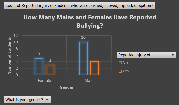 This graph shows how many males and females have reported bullying done to themselves or someone else. 3 females said they have but 5 said they haven’t. 4 males said they have but 10 said they haven’t. This means most people in the survey were either to scared or embarrassed. A total of 7 people have reported bullying but 15 have not. This graph may be incorrect because some people might not want to admit that they’ve reported bullying.