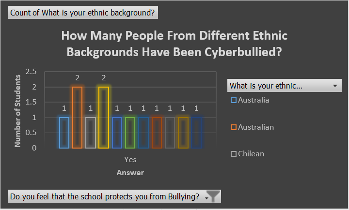 This graph shows how many people from different ethnic backgrounds have been cyberbullied. 3 Australians have been cyberbullied compared to 1 of each ethnic background. This is because there is more Australians in this survey. This Graph may be incorrect because of the amount of different data sets for the same thing and because some people might not want to admit that they’ve been cyber bullied.