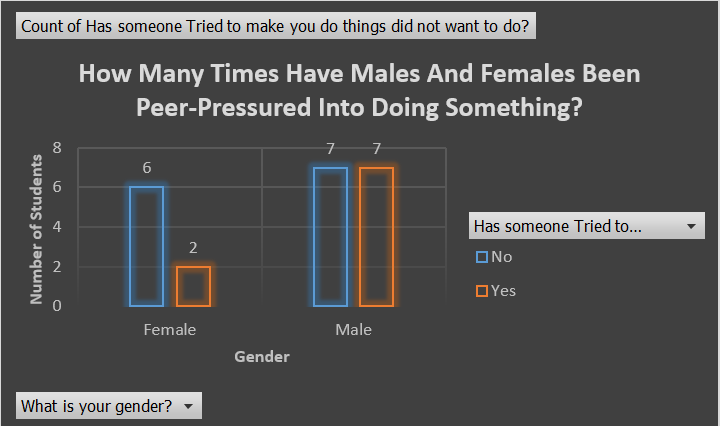 This graph shows how many males and females have been peer-pressured into doing something. 6 females have not been peer-pressured into doing something but 2 have. 7 males have not been peer-pressured into doing something but 7 have. The reason there are more males who have not been peer-pressured than females and more who have been peer-pressured than females is that there is more males than females. There is a total of 13 people who have not been peer-pressured and 9 who have been peer-pressured. This graph may be incorrect because some people might not want to admit that they’ve been peer-pressured.
